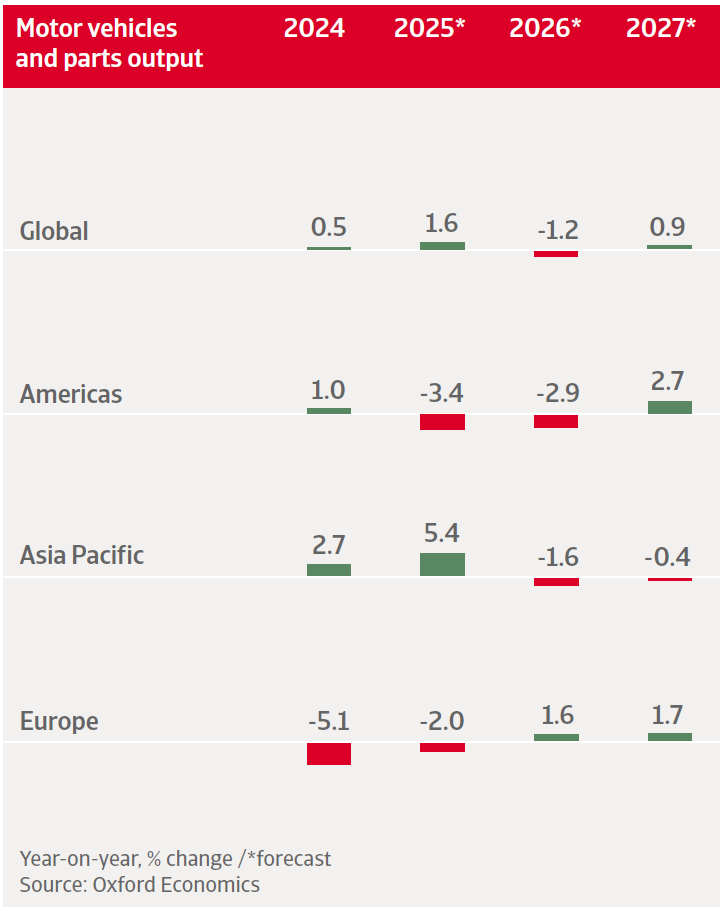 • Global: We expect global motor vehicles and parts production to grow by 1.6% in 2025, followed by a 1.2% contraction in 2026. This decrease is partly due to the US tariffs