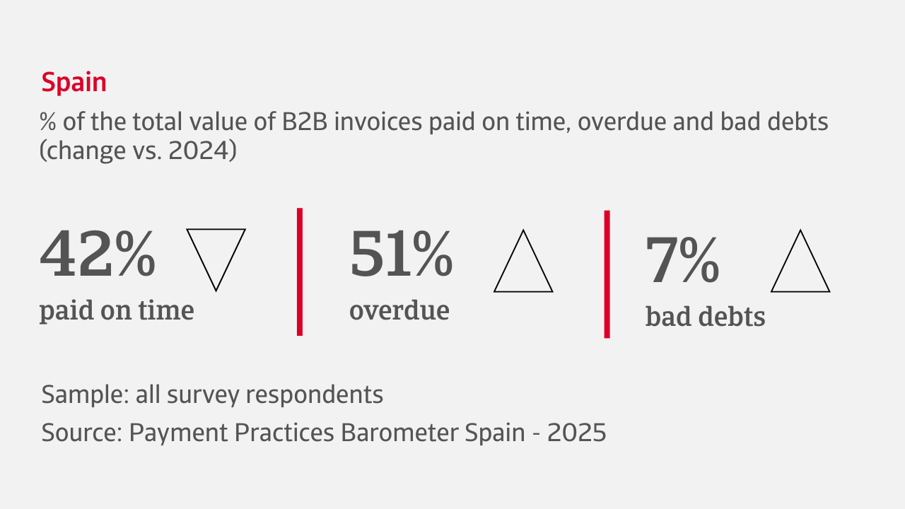 - Most Spanish companies report no improvement in B2B customer payment patterns compared to last year, indicating ongoing financial instability among customers